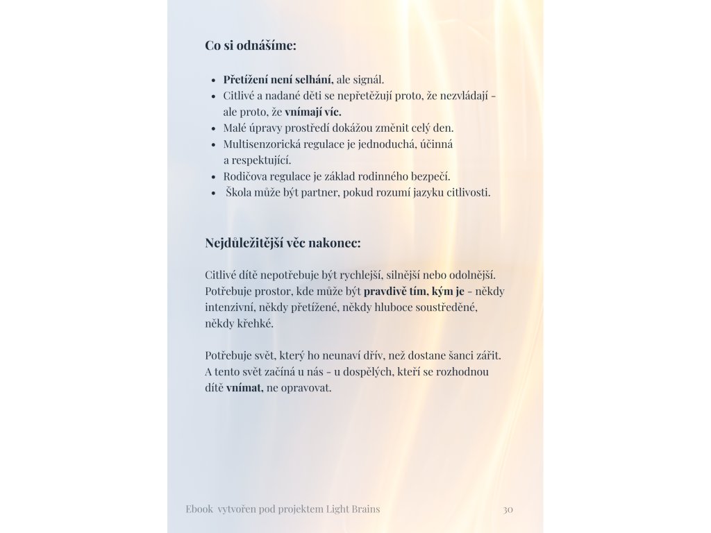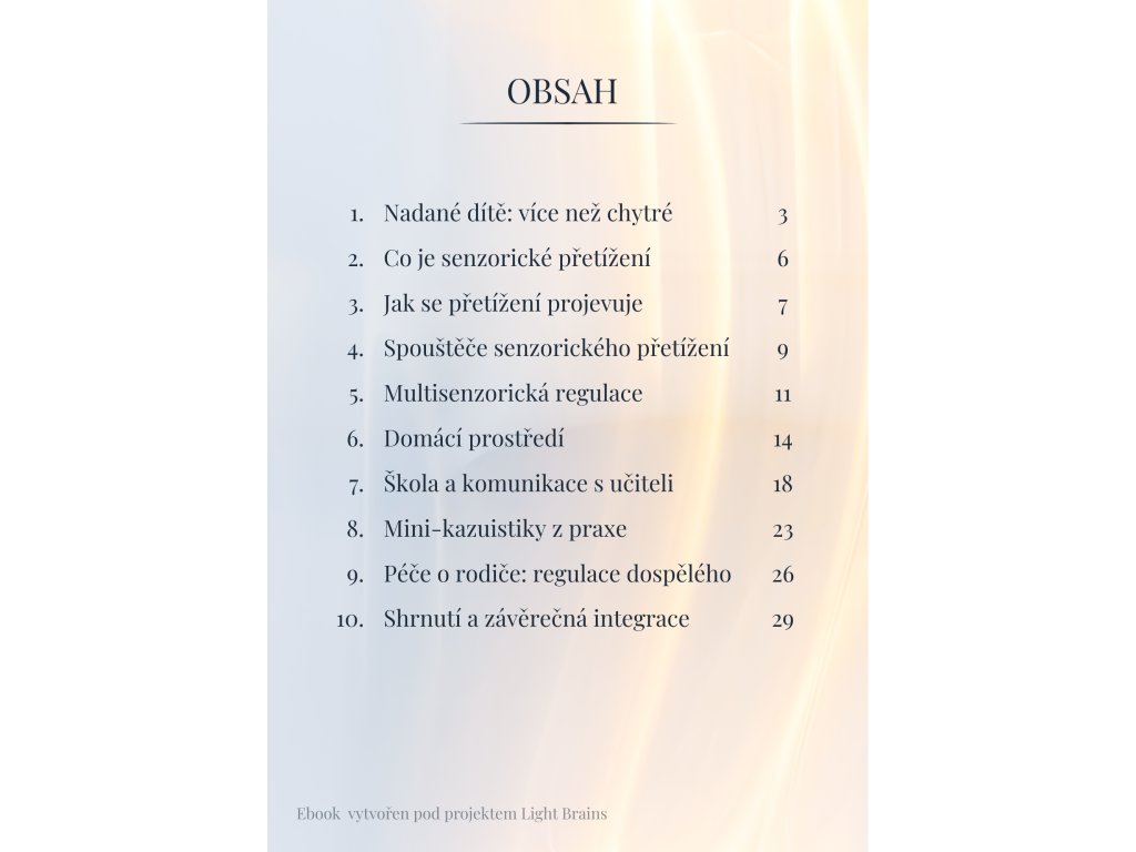 Tento e-book je průvodcem světem nadaných a vysoce citlivých dětí, které se snadno dostávají do senzorického přetížení. Pomáhá porozumět tomu, co se děje v nervové soustavě dítěte, a nabízí klidný, srozumitelný rámec, jak na přetížení reagovat s respektem a pochopením.